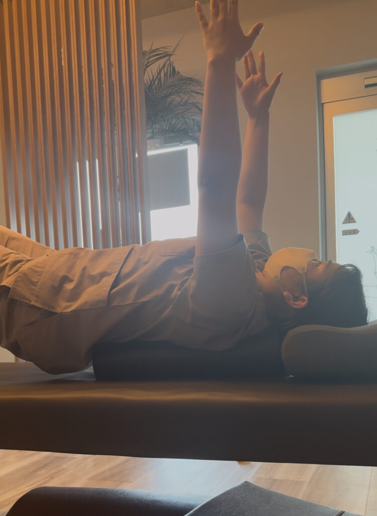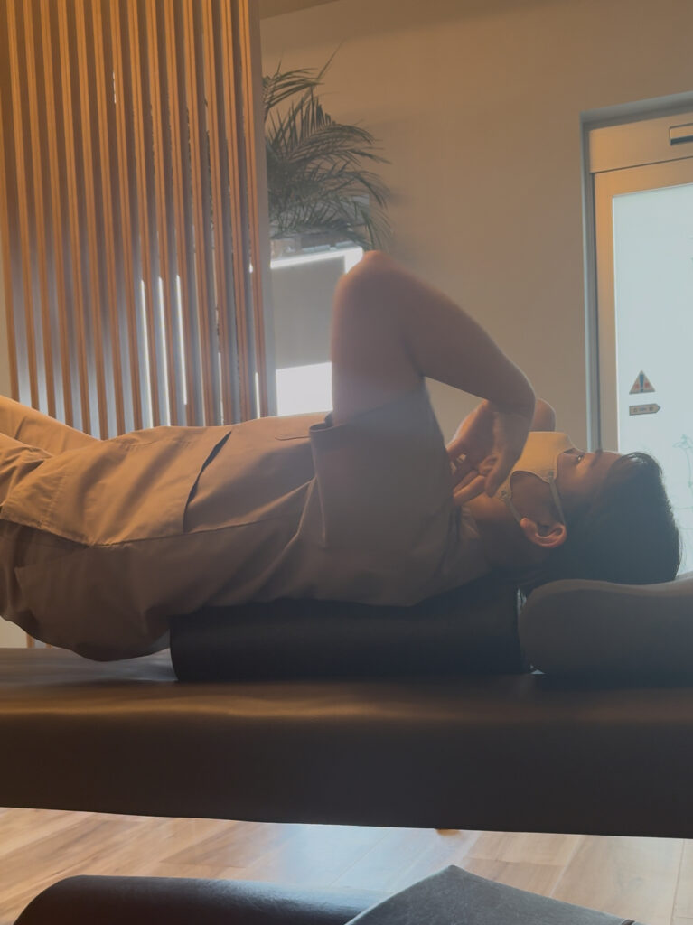 ①ストレッチポールを背骨に沿わせるように入れ、お尻は浮かせて頭には枕をいれる